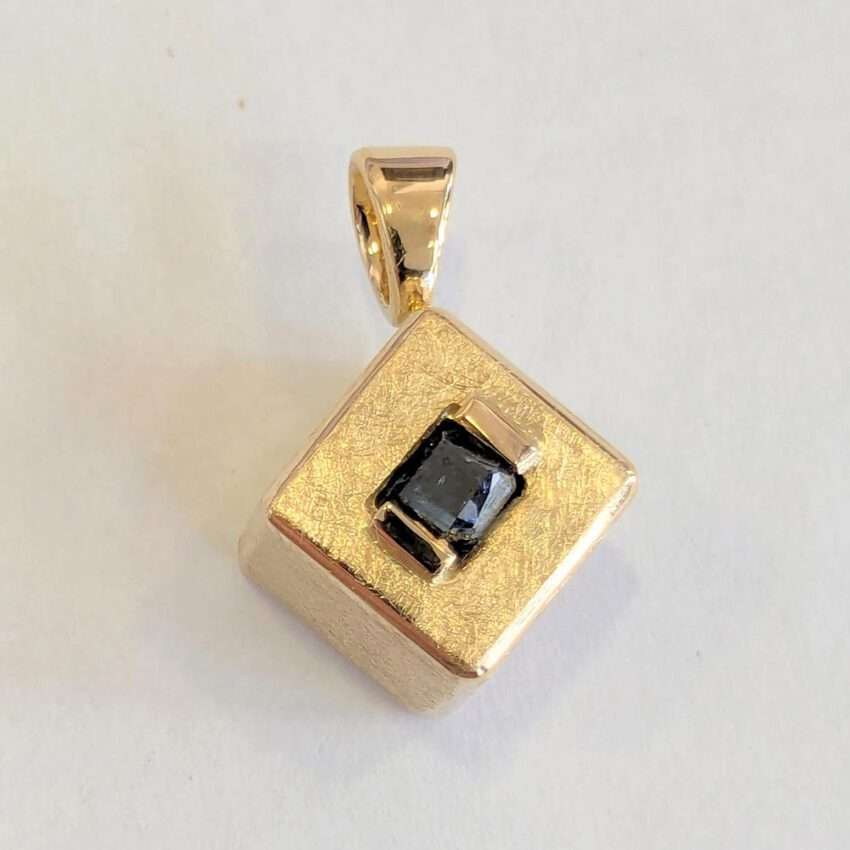 Dieser Anhänger ist etwas ganz besonderes: In 750er Gelbgold wurde ein Würfel als Anhänger gefertigt. Auf der Vorderseite ist ein blauer ungeschliffener Erinnerungsdiamant mit zwei Streifenkrappen eingefasst. Erinnerungsdiamant bedeutet, dass aus der Asche eines geliebten Menschen ein Diamant gefertigt wurde….